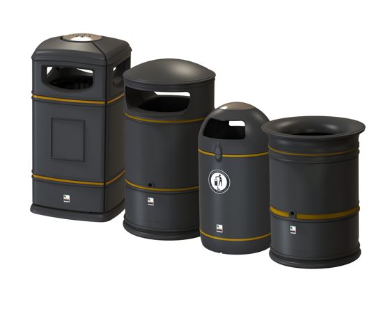 La gama de papeleras Heritage está diseñada para complementar el entorno tradicional, ya que nuestras opciones estándar proporcionan un cuerpo negro con bandas doradas, aunque tambié incluyan colores alternativos disponibles a pedido. Ciertos diseños dentro de la gama también pueden acomodar extras, tales como; Sensores, placas de protección, ceniceros y extintores.